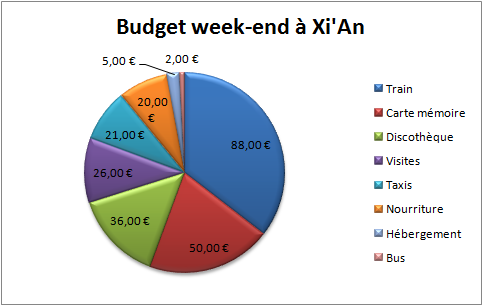 Si vous envisagez de voyager en Chine ou à Xi’An, voici pour vous une estimation des dépenses que j’ai réalisées lors du week-end à Xi’An. Bien évidemment, vos dépenses dépendent de vos visites (si vous les faites par vous-même ou en tour organisé), du confort que vous souhaitez… Voici toutefois un budget du week-end pour vous faire une idée des prix en Chine. Au total, j’ai dépensé 248 euros pour ce week-end à Xian, environ 60% de moins que lorsque j’ai été à Hong-Kong