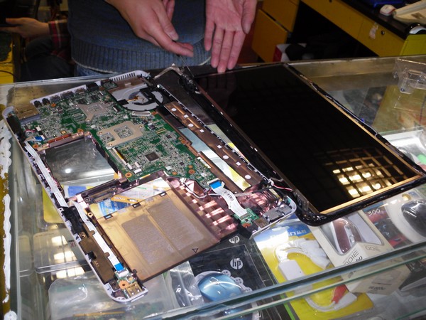 L’écran de mon ordinateur portable, pourtant vieux de 4 mois seulement a lâché d’un moment à l’autre. Sans doute un défaut de conception, de nombreux possesseurs du Pavilion DV6 souffrant du même problème (Fabrice, tu feras attention). N’ayant pas trouvé de contact chez HP en Chine et ayant besoin de toutes façons d’une réparation rapide, je suis allé dans un temple de l’informatique sur plusieurs étages faire réparer mon PC. Voici une photo de mon PC démonté (pauvre bête). Le PC remarche nettement mieux depuis mais cela a coûté cher: la réparation et un nouvel écran: 1050 yuans (environ 135 euros) contre une première offre à 1480 yuans (190 euros) grâce à un ami russe qui m’a aidé à négocier le prix.